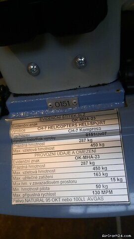 Sommario | Tipo: | Elicottero (Motore a Pistoni) | Costruttore: | CH-7 | Modello: | CH-7 Kompress | Anno di costruzione: | 2007 | Numero di serie: | 0151 | Caratteristiche: | Tenuto nel hangar | Ubicazione/sede: | Germania | Tempo complessivo (TTAF): | 120 h | Prezzo: | € 65'000 (~ CHF 59'982) | Numero di passeggeri: | 2 |