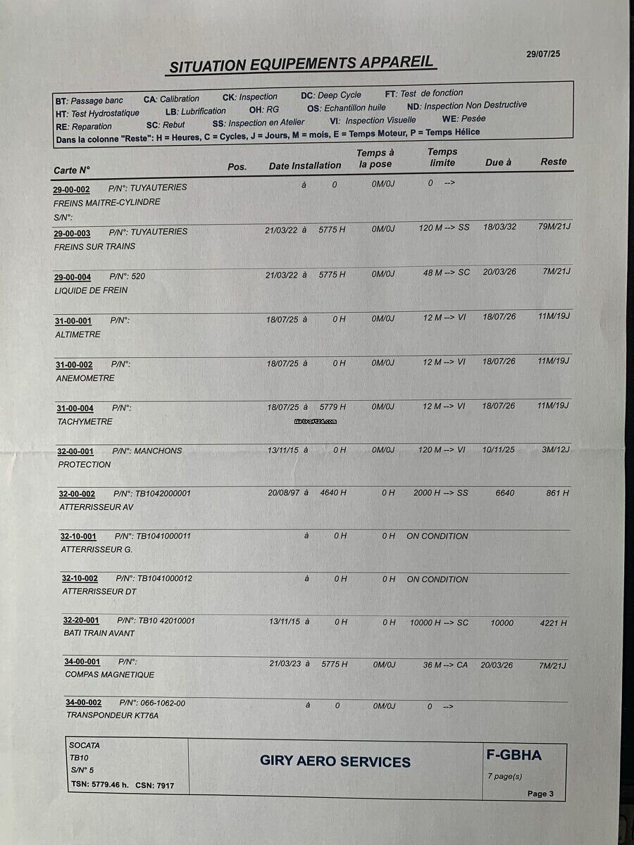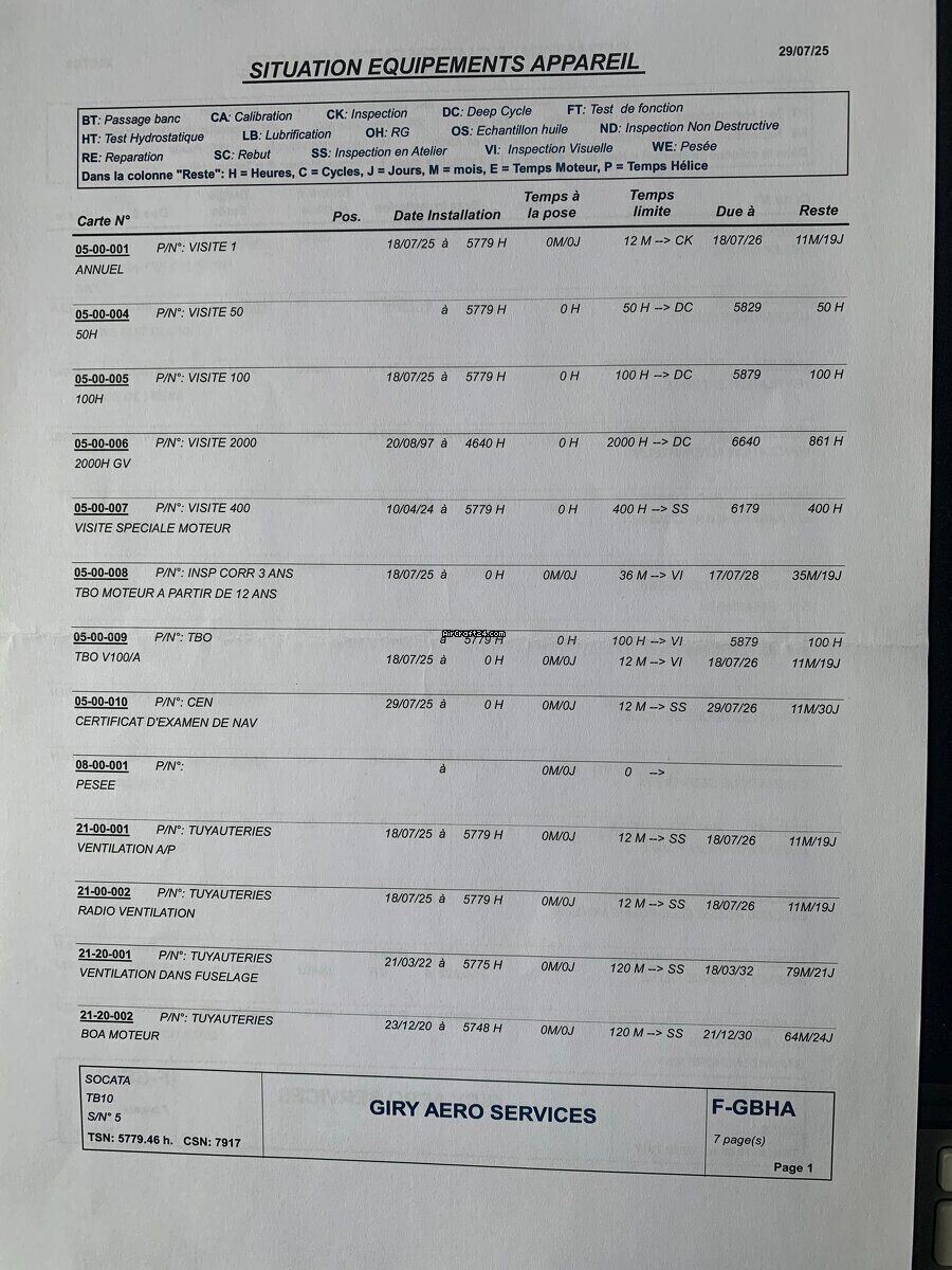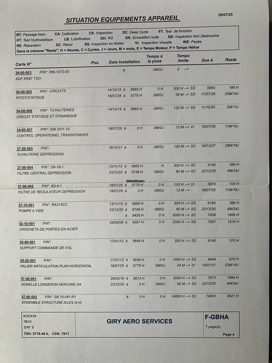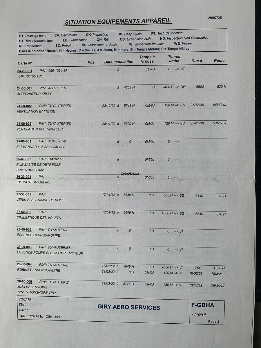 | Sommario | | Tipo: | Propulsione singola | | Costruttore: | Eads/Socata | | Modello: | TOBAGO TB 10 | | Anno di costruzione: | 1978 | | Numero di registrazione: | F-GBHA | | Numero di serie: | 0005 | | Caratteristiche: | Tenuto nel hangar | | Ultima annuale: | 5/2025 | | Ubicazione/sede: | Francia, Gueret, LFCE | | Tempo complessivo (TTAF): | 5779 h | | Prezzo: | € 42'000 (~ CHF 39'136) | | EU IVA Tassata: | si | | Numero di passeggeri: | 5 |